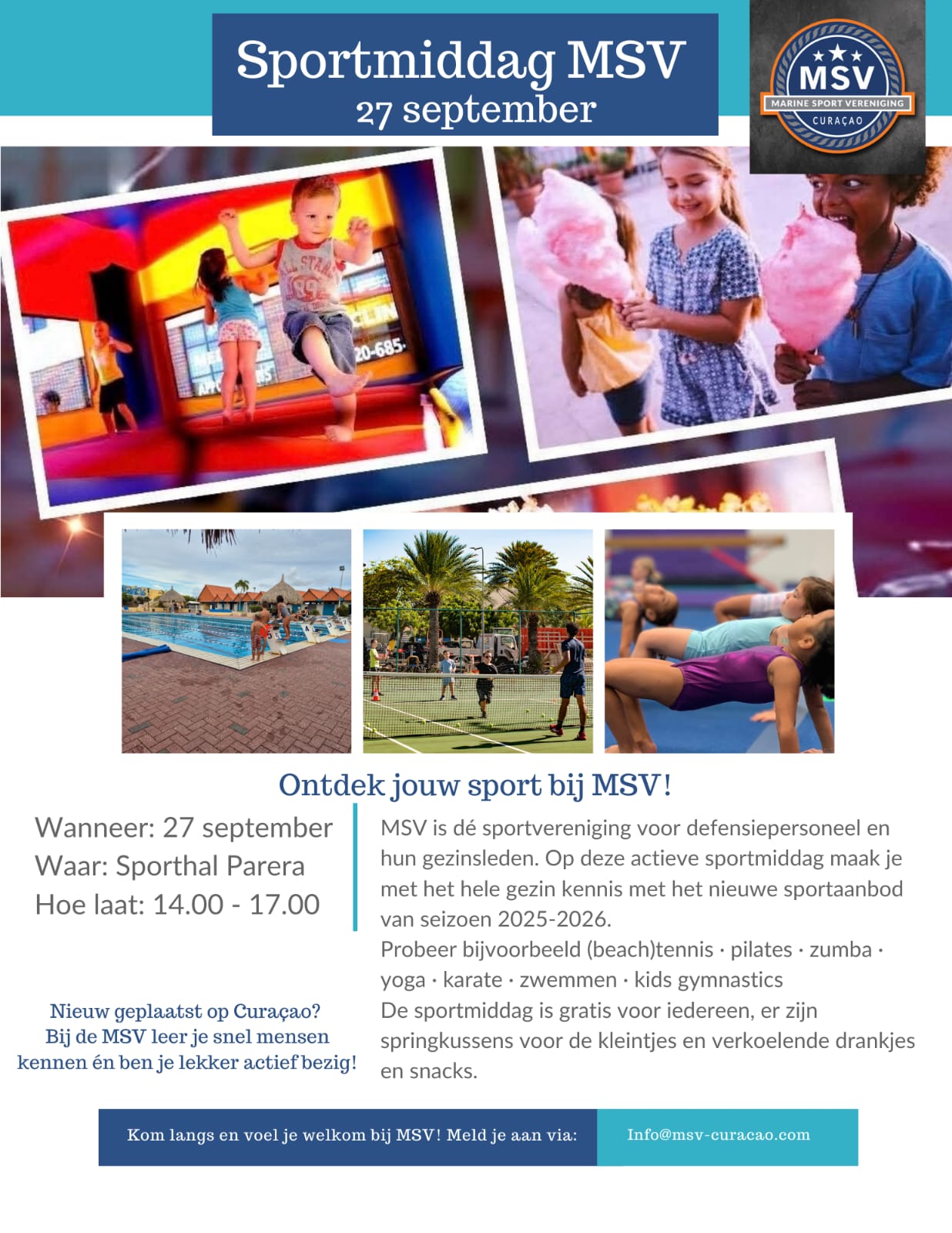 Sportmiddag bij Marine Sport Vereniging Curaçao! Zaterdag 27 september is het zover: van 14:00 tot 17:00 uur verandert de sporthal in Parera in een sport- en feestparadijs! Doe mee met miniworkshops zumba, pilates, karate, kidsgym en tennis. Voor de kids zijn er springkussens én een kleurwedstrijd. Iedereen kan genieten van snacks en verkoelende drankjes. En het mooiste? Het is helemaal gratis!